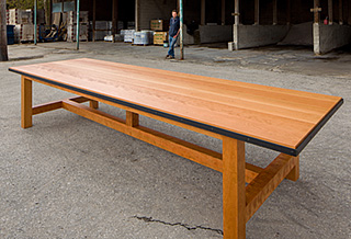 12' long x 48" wide. Wide plank, antique Cherry. Steel frame with rivets. Other sizes and wood species available. Contact us for more information.